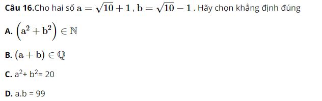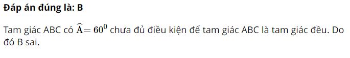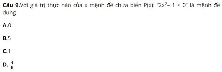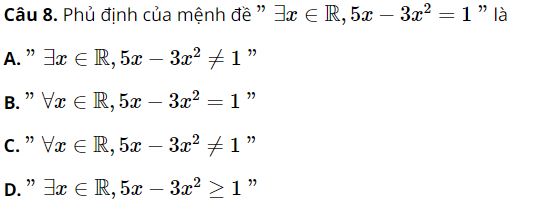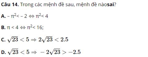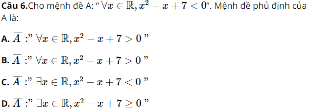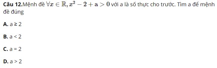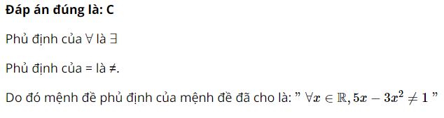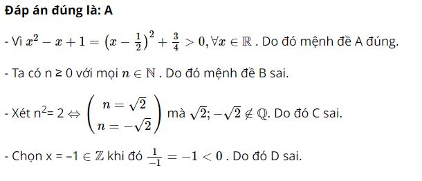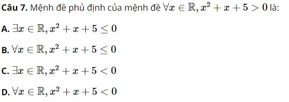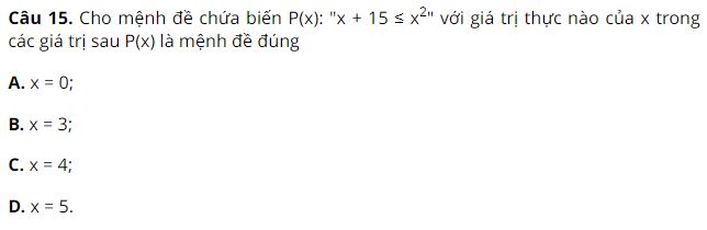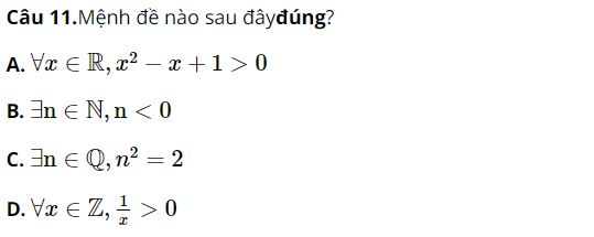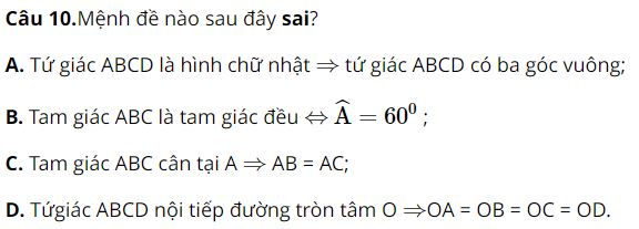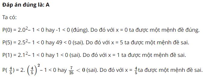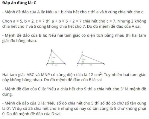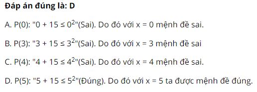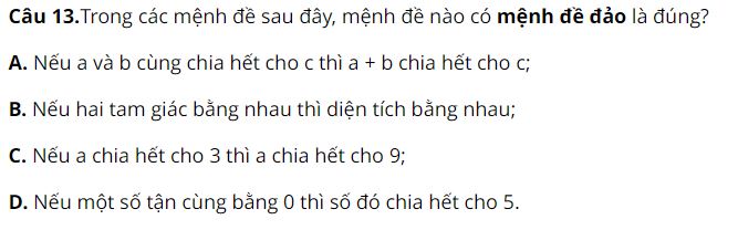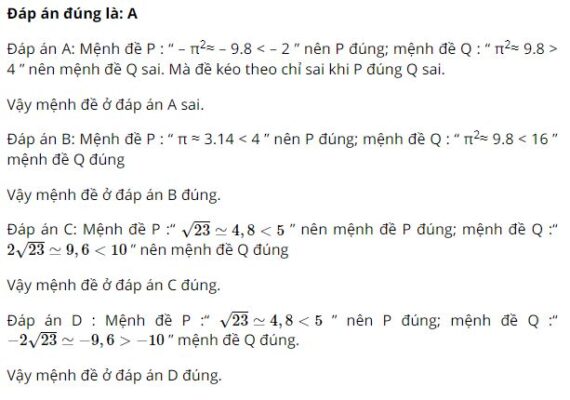 Toán 1016 Bài tập Mệnh đề (có đáp án) – Kết nối tri thức Trắc nghiệm Toán 10 Đăng vào 22/03/202422/03/2024 bởi gdnn - gdtx 16 Bài tập Mệnh đề (có đáp án) - Kết nối tri thức Trắc nghiệm Toán 10 Với 16 bài tập trắc nghiệm Mệnh đề Toán lớp 10 có đáp án và lời giải chi tiết đầy đủ các mức độ sách Kết nối tri thức sẽ giúp học sinh ôn luyện trắc nghiệm để biết cách làm các dạng bài tập Toán 10. 1 / 17 Câu 1. Trong các câu sau, câu nào là mệnh đề? A. Đi ngủ đi! B. Trung Quốc là nước đông dân nhất thế giới. C. Bạn học trường nào? D. Không được làm việc riêng trong giờ học. Đáp án đúng là: B Chỉ có câu “Trung Quốc là nước đông dân nhất thế giới” có thể xác định được tính đúng sai nên đáp án B là mệnh đề. 2 / 17 Câu 2. Trong các câu sau, câu nào không phải là mệnh đề? A. Buồn ngủ quá!; B. Hình thoi có hai đường chéo vuông góc với nhau; C. 8 là số chính phương; D. Băng Cốc là thủ đô của Mianma. Đáp án A là câu cảm thán không xác định được tính đúng sai. Do đó không phải là mệnh đề. 3 / 17 Câu 3. Trong các câu sau, có bao nhiêu câu là mệnh đề? a) Hãy đi nhanh lên! b) Hà Nội là thủ đô của Việt Nam. c) 4 + 5 + 7 = 15. d) Năm 2018 là năm nhuận. A.4 B.3 C.1 D. 2 Câu a) là câu cảm thán không xác định được tính đúng, sai nên câu a không phải là mệnh đề. Các câu b), c), d) đều có thể xác định được tính đúng sai. Do đó các câu b), c), d) đều là mệnh đề. Vậy có tất cả 3 mệnh đề. 4 / 17 Câu 4.Câu nào sau đây không là mệnh đề? A. x > 2; B.3 < 1; C.4 – 5 = 1; D. Tam giác đều là tam giác có ba cạnh bằng nhau. A. B. C. D. Vì x > 2 là mệnh đề chứa biến không xác định được tính đúng sai nên không phải mệnh đề. 5 / 17 Câu 5. Trong các mệnh đề sau, mệnh đề nào là mệnh đề đúng? A.Tổng của hai số tự nhiên là một số chẵn khi và chỉ khi cả hai số đều là số chẵn B.Tích của hai số tự nhiên là một số chẵn khi và chỉ khi cả hai số đều là số chẵn C.Tổng của hai số tự nhiên là một số lẻ khi và chỉ khi cả hai số đều là số lẻ D.Tích của hai số tự nhiên là một số lẻ khi và chỉ khi cả hai số đều là số lẻ A là mệnh đề sai: Ví dụ: 5 + 3 = 8 là số chẵn nhưng 5, 3 là số lẻ. B là mệnh đề sai: Ví dụ: 2.3 = 6 là số chẵn nhưng 3 là số lẻ. C là mệnh đề sai: Ví dụ: 1 + 3 = 4 là số chẵn nhưng 1, 3 là số lẻ. 6 / 17 A B C D 7 / 17 A B C D 8 / 17 A B C D 9 / 17 A B C D 10 / 17 A B C D 11 / 17 A B C D 12 / 17 A B C D 13 / 17 A B C D 14 / 17 A B C D 15 / 17 A B C D 16 / 17 A B C D 17 / 17 A B C D Your score isThe average score is 56% 0% LÀM LẠI Singapore – Hệ thống Giáo dục tiên tiến và Đa dạng 10 Kỹ Năng Mềm Cần Thiết Cho Học Sinh Phổ Thông: Xây Dựng Nền Tảng Cho Tương Lai